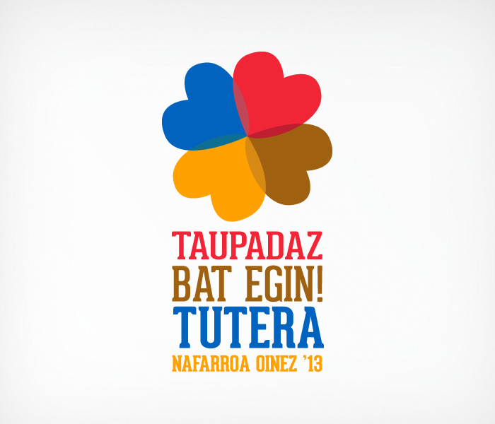 Así que la primera parte del trabajo consistió en la búsqueda de ese eslogan. Tras muchas vueltas, pruebas, idas y venidas di con el eslogan adecuado. Taupadaz bat egin! Es plural (bat egin), dinámico, original, y emocional (pulso, corazones, unión).
