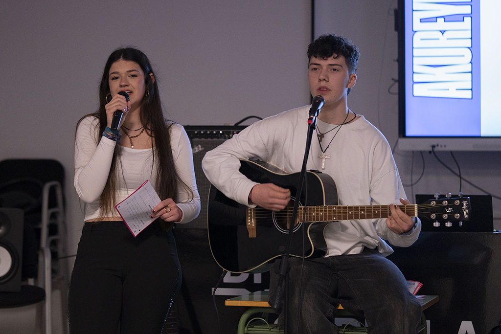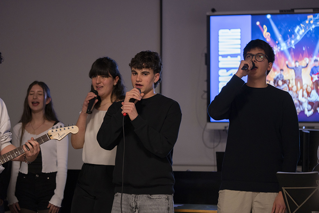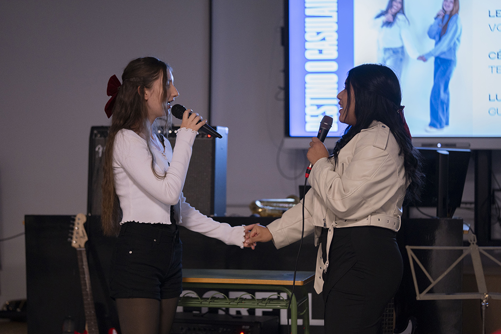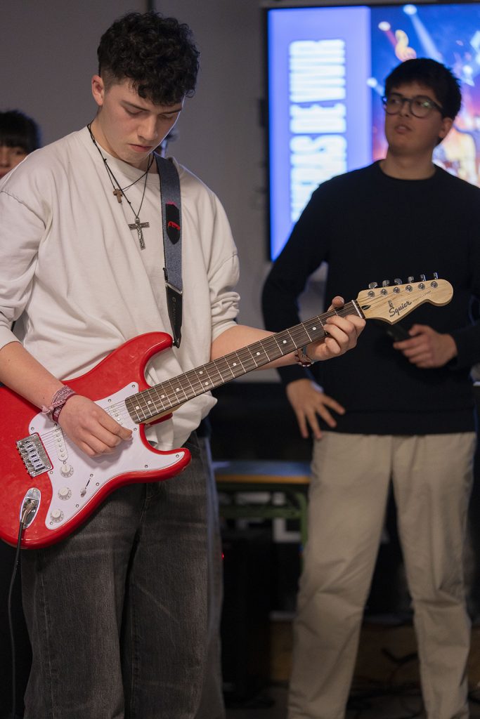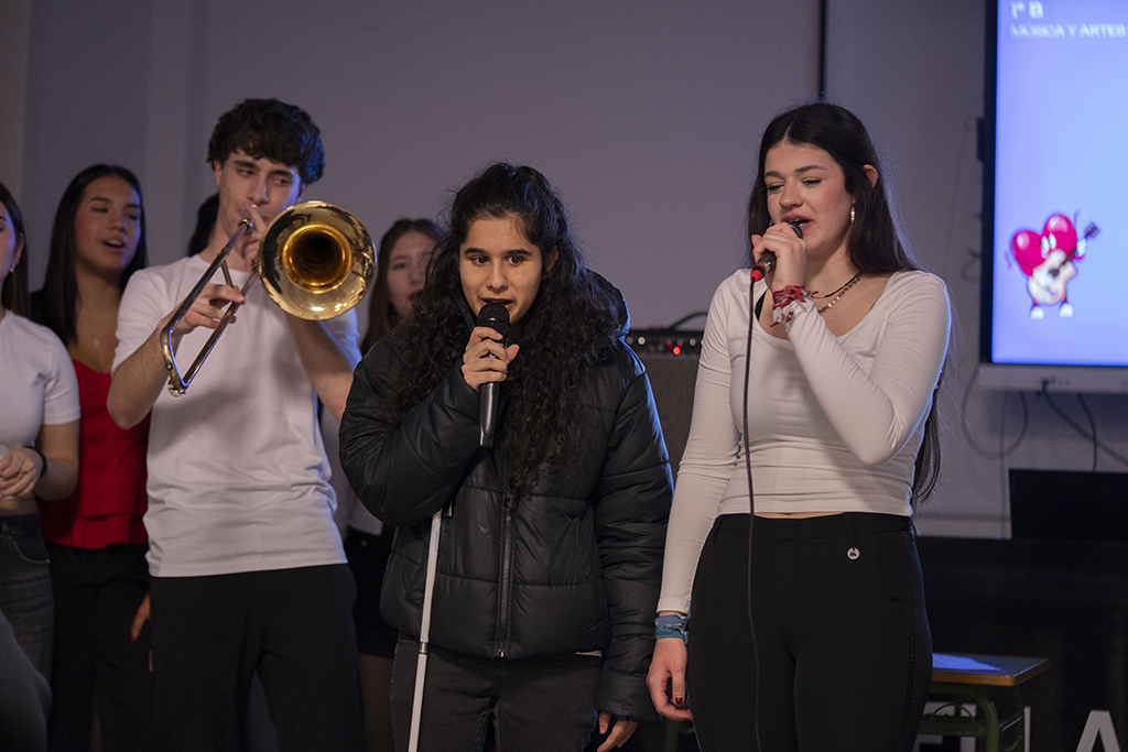 El espacio se habilitó como escenario para el desfile de disfraces y la actuación musical. El concierto formaba parte de la evaluación de la materia, integrando interpretación y puesta en escena ante público. El jurado del concurso de disfraces reconoció la propuesta de Saray Gómez y Sara Delgado (2.ºA de Bachillerato), caracterizadas como Van Gogh y Los girasoles.