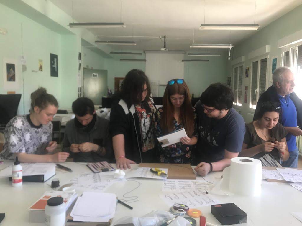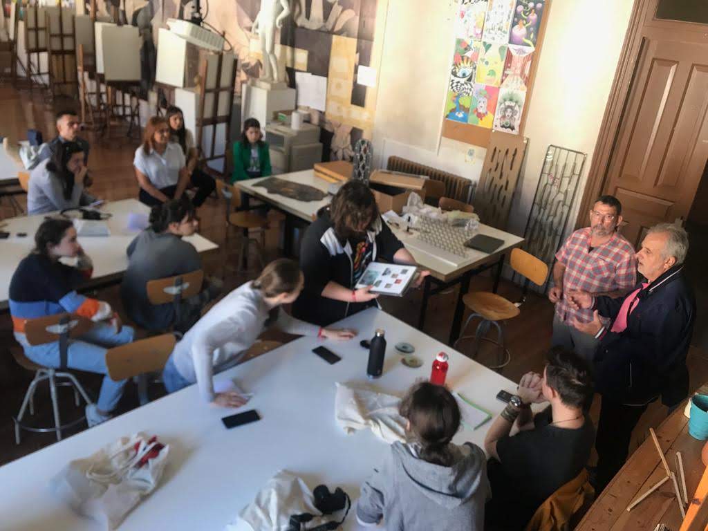 ¡En la Escuela no paramos! Durante las primeras semanas de curso, del día 3 al día 19 de octubre, contamos con la visita de 9 alumnos/as franceses y varios profesores (entre ellos Mr. Valls, profesor con raíces corellanas), que vinieron a realizar una estancia Erasmus+ de dos semanas. Los días que estuvieron aquí estuvieron repletos de actividades. Por las mañanas, muchos profesores impartieron talleres (fotografía con Fito, ebanistería con Manuel, encuadernación con Ana, tapizado con José María, vidrieras con Nicolás Sartaguda, etc) y se hicieron excursiones (a Pamplona para ver el Museo de Navarra con el alumnado de la Escuela y a Tudela para ver la exposición “Héroes ocultos. Inventos geniales. Objetos cotidianos” organizada por Caixabank). Por otra parte, el alumnado francés pudo visitar otras ciudades y lugares como, por ejemplo, Tudela, Tarazona, Zaragoza y las fiestas del Pilar, Pamplona, Segovia y la Real Fábrica de Cristales, Madrid, Bilbao y el Guggenheim, etc.